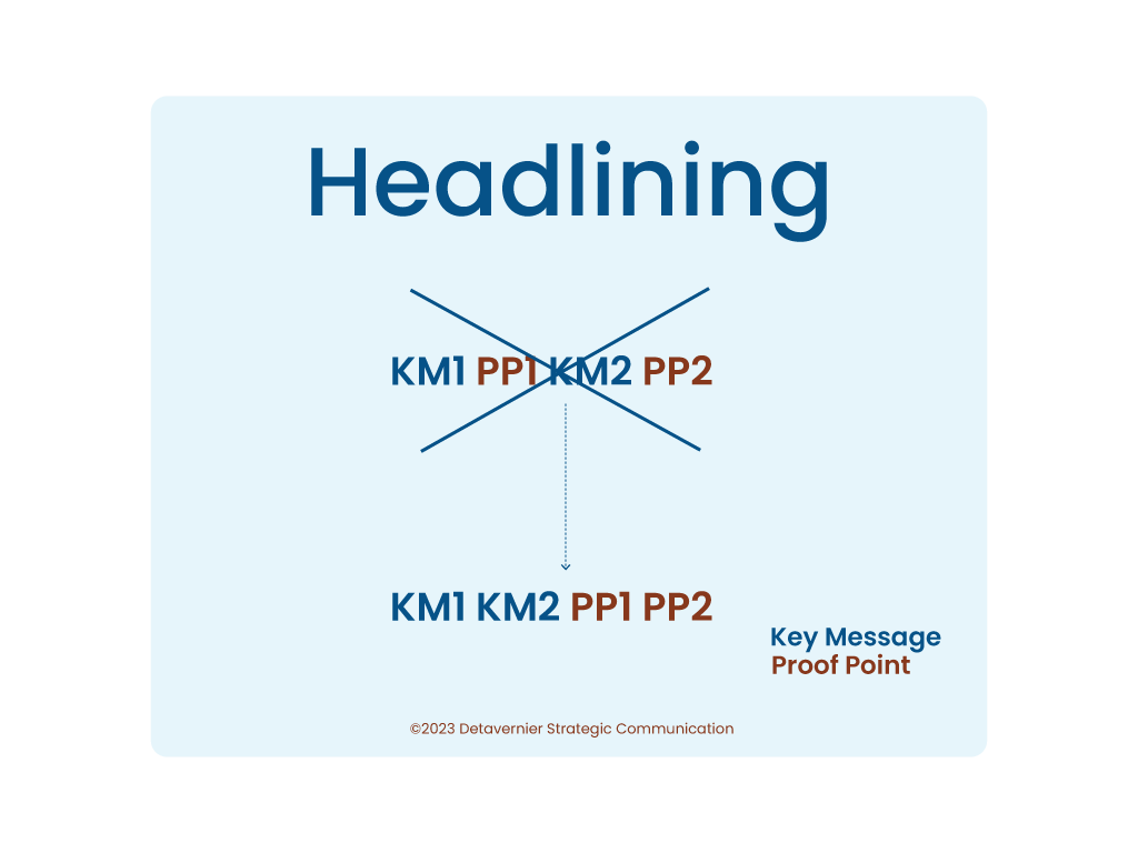 Headlining is one such delivery technique. Like repetition, flagging, and bridging, it is designed to ensure that key messages actually reach the audience. Headlining means that a spokesperson leads with the core message first and then elaborates on that message with proof points. When there is more than one key message, those messages are grouped and followed by proof points that support one or several of them.